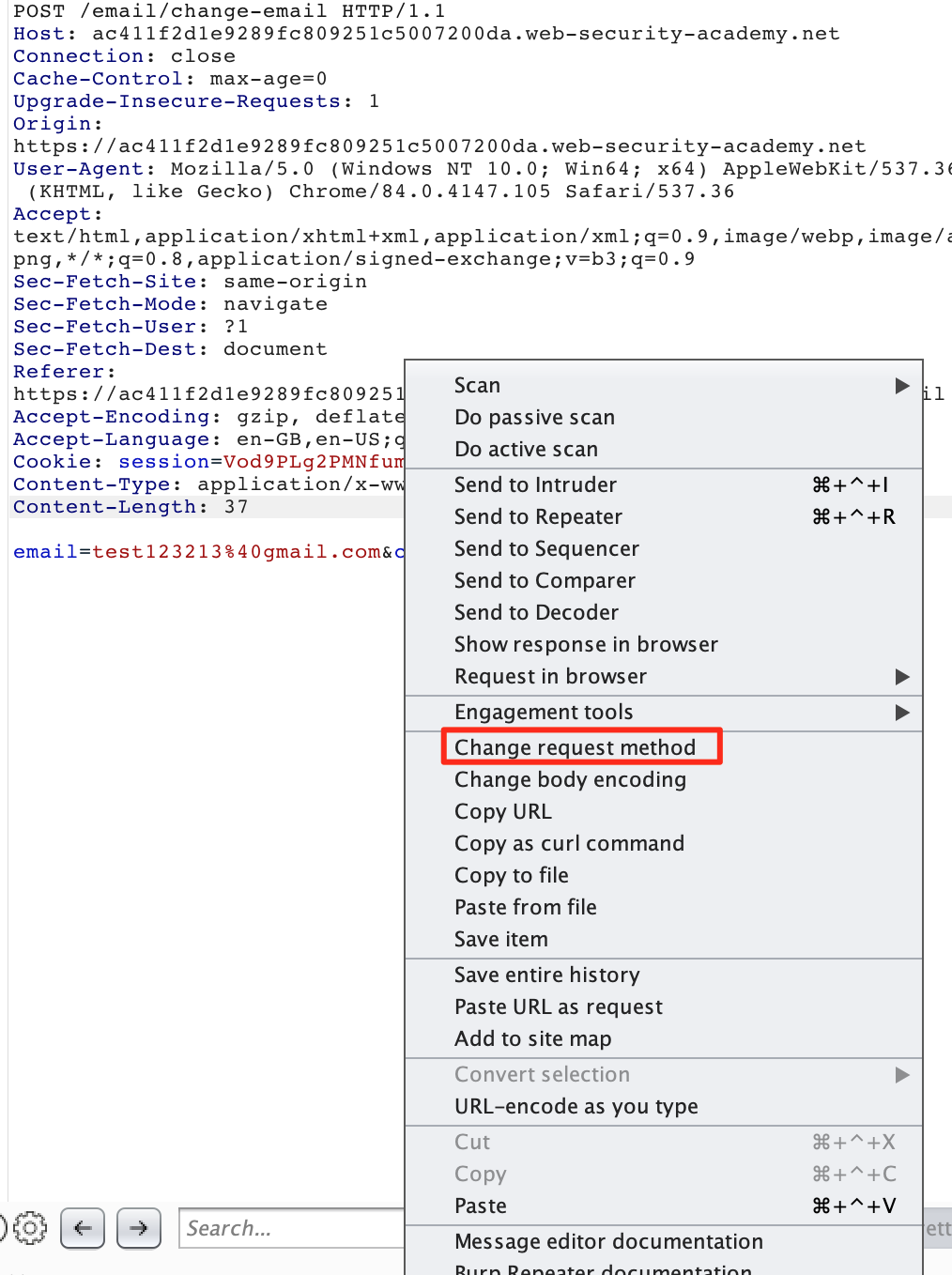 However we can also send our POST parameters as GET parameters in a GET request. Some servers also accept GET requests instead of POST request. Burp can easily transform our method by right clicking the request and picking "change request method" from the context menu.