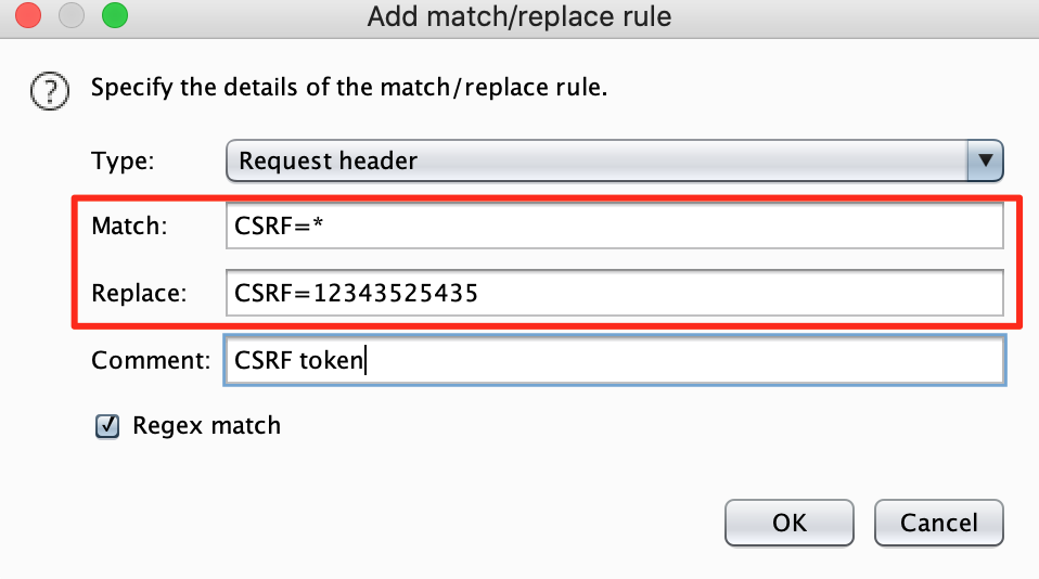 Fill in the regex to indicate to burp how it can find the CSRF token in your request and replace it with a value of your own. Be careful, this is just an example, it may be different for your target.