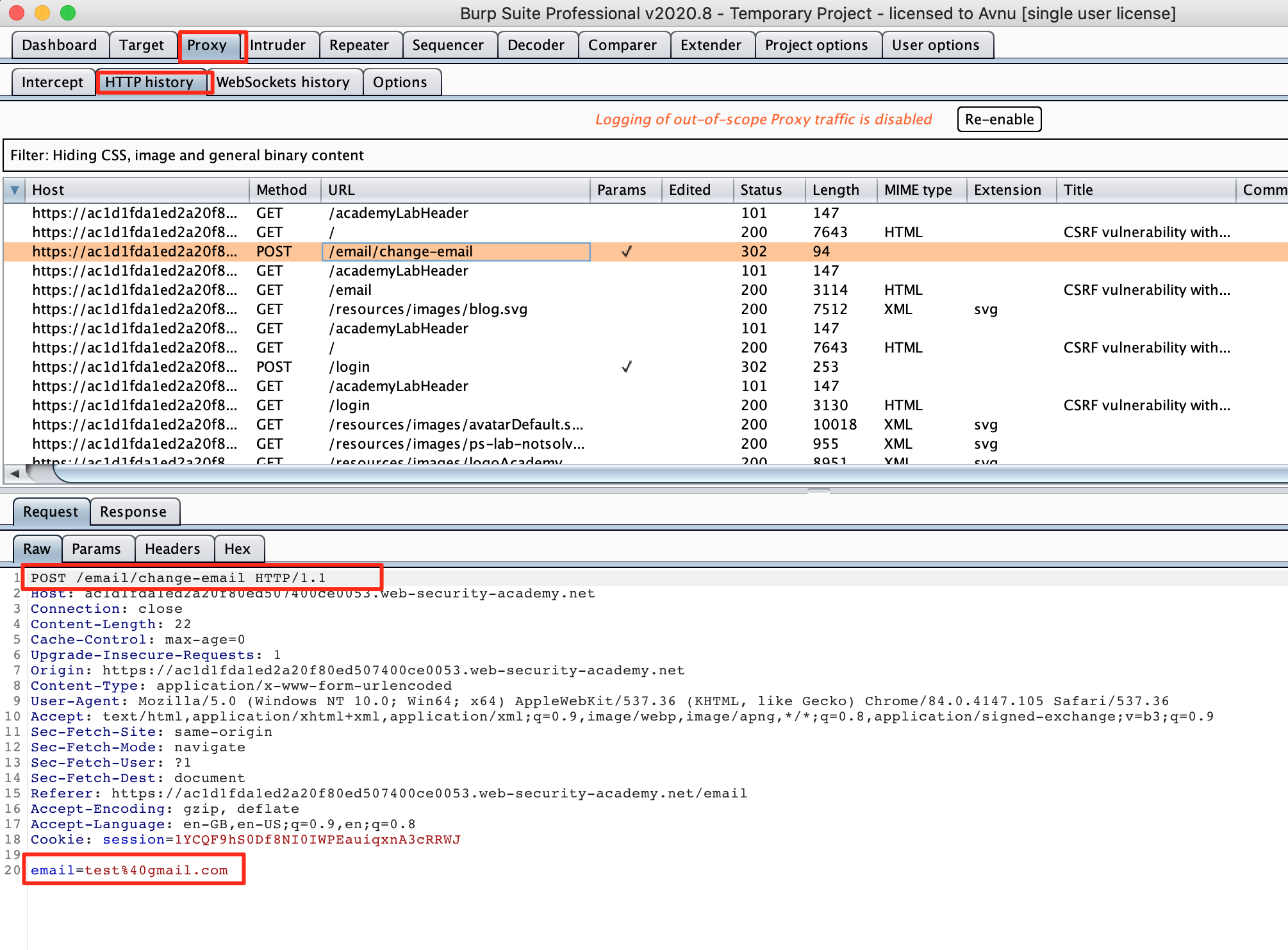 With your browser proxying traffic through Burp Suite, log in to your account, submit the "Change email" form, and find the resulting request in your Proxy history. If you're using Burp Suite Professional, right-click on the request, and from the context menu select Engagement tools / Generate CSRF PoC.