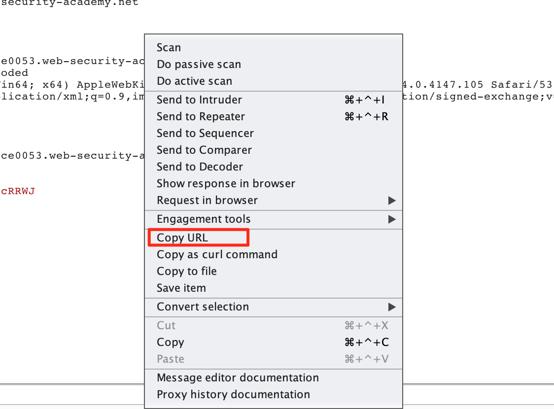 Copy the email parameter from the request in burp and paste it in the PoC generator, make sure you make some changes so you can verify this CSRF attack later on. To grab the URI, we can right click on our request in burp and click on "Copy URL" from the dropdown menu.