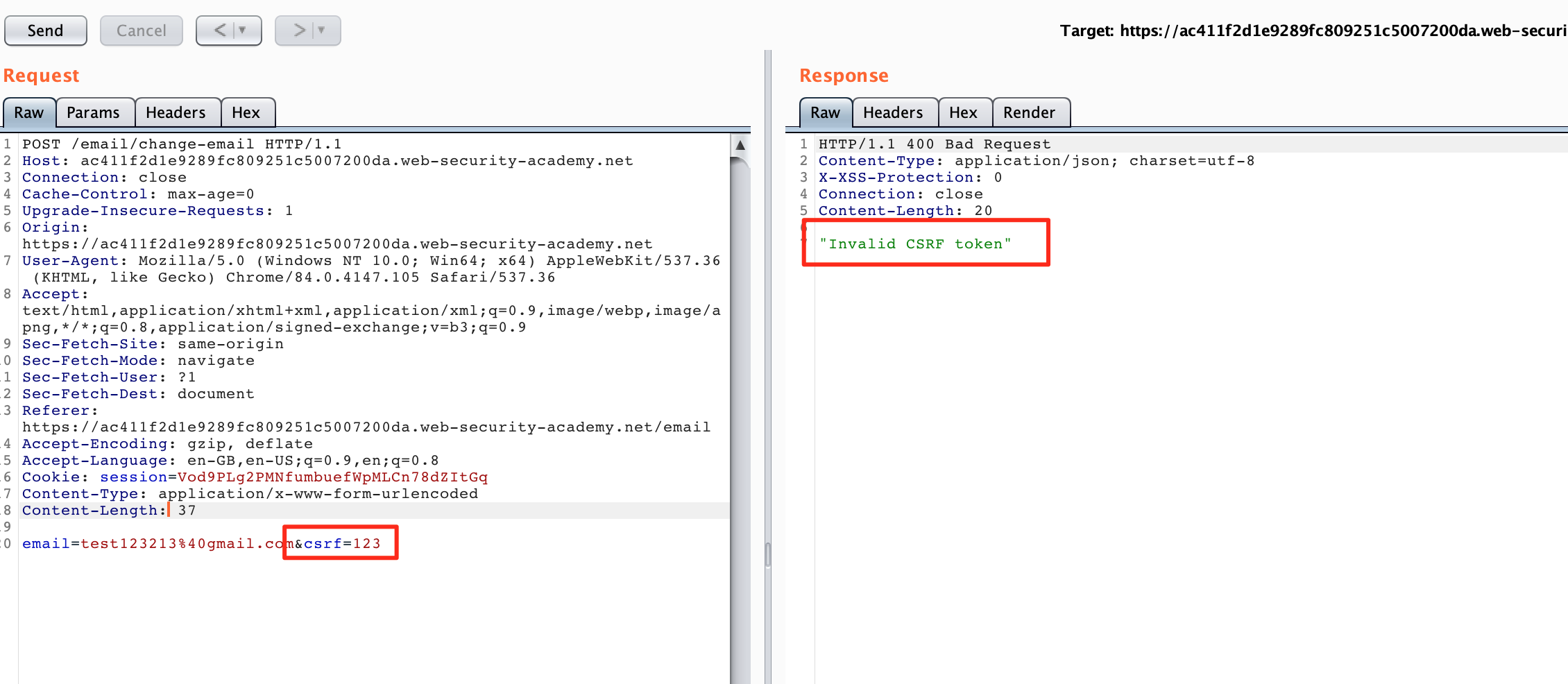 If we change our provided CSRF token, we can see that our request is not accepted.
